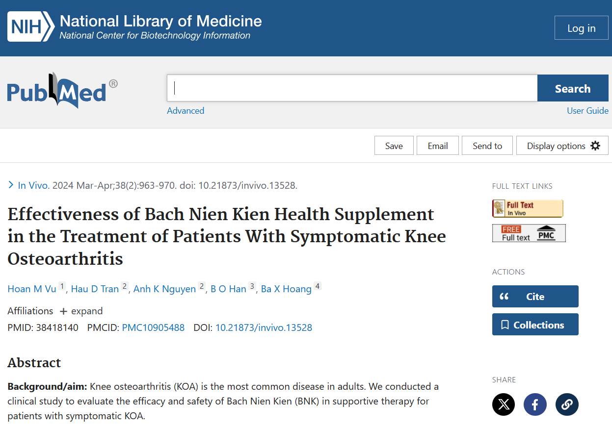 Bách Niên Kiện - Sản phẩm xương khớp của Việt Nam được khẳng định hiệu quả và đăng kết quả nghiên cứu trên Thư viện y khoa Hoa Kỳ ( PubMed)