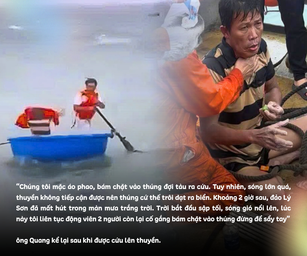 Theo lời kể của ông Quang - người được cứu đầu tiên sau khi chiếc thúng lật, cả ba nhờ có áo phao nên cố gắng bám chặt nhau, vừa động viên, vừa thay nhau nói chuyện để giữ tỉnh táo. Gió thổi mạnh, sóng đánh liên hồi, nước mặn xộc vào mắt và miệng, nhưng họ vẫn kiên cường không buông tay.