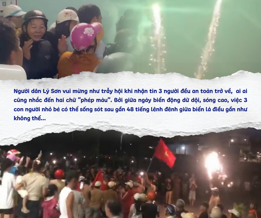 Khi tàu vừa cập bến, đưa ông Quang và ông Sanh - hai người được ví von là “người hùng không áo choàng” trở về an toàn trong vòng tay người thân, gia đình. Đêm qua, cả Lý Sơn như không ngủ. Trong tiếng sóng vỗ bờ, người dân kể cho nhau nghe về phép màu vừa diễn ra, về lòng quả cảm của hai người dân nghĩa hiệp và hành trình sinh tồn phi thường của ba con người nhỏ bé giữa đại dương bao la.