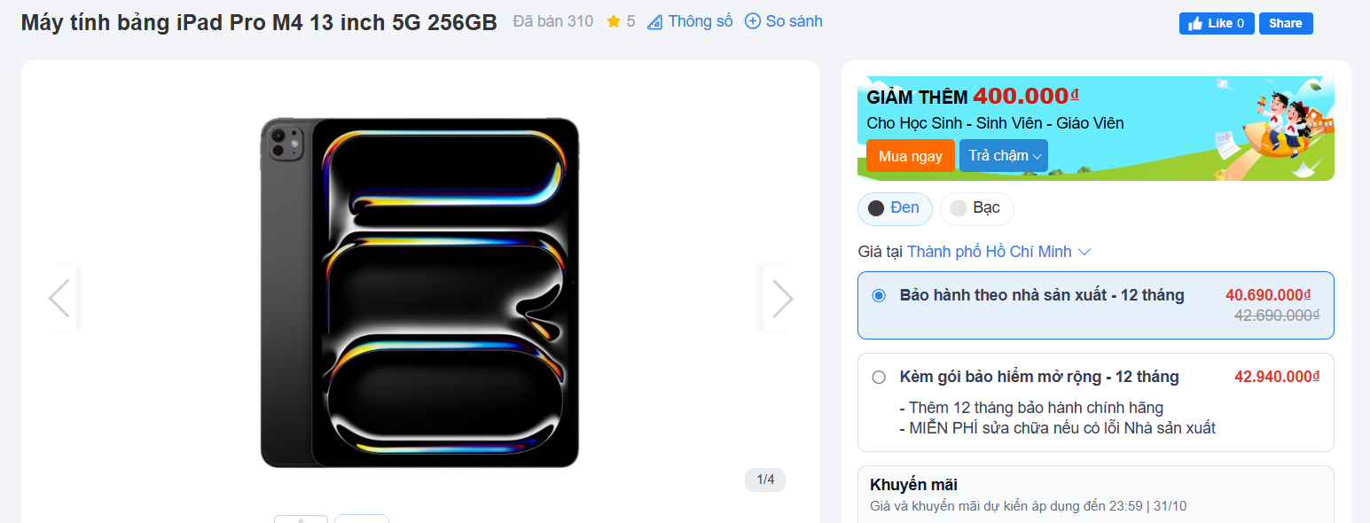 Cụ thể, nhiều hệ thống bán lẻ lớn ghi nhận mức giảm từ vài trăm nghìn đến hàng triệu đồng, tuỳ phiên bản và dung lượng bộ nhớ. Điều đáng chú ý là mức giảm không chỉ áp dụng cho sản phẩm cũ mà còn xuất hiện ở cả những model iPad Pro M4. Tuy nhiên, nhiều phiên bản đã rơi vào tình trạng hết hàng.