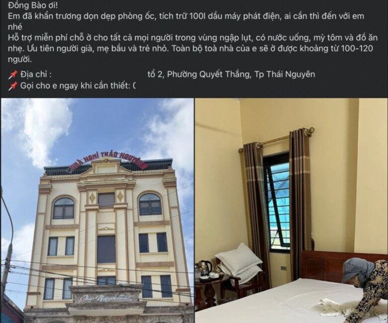 Chủ một nhà nghỉ ở phường Quyết Thắng, tỉnh Thái Nguyên chia sẻ trên mạng xã hội thông tin mở cửa miễn phí để đón người dân vào tránh lũ lụt nhận được lời tán dương từ cộng đồng.