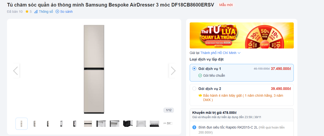 | Tủ chăm sóc quần áo thông minh Samsung Bespoke AirDresser 3 móc DF18CB8600ERSV | 46.19 | 37.49 | |