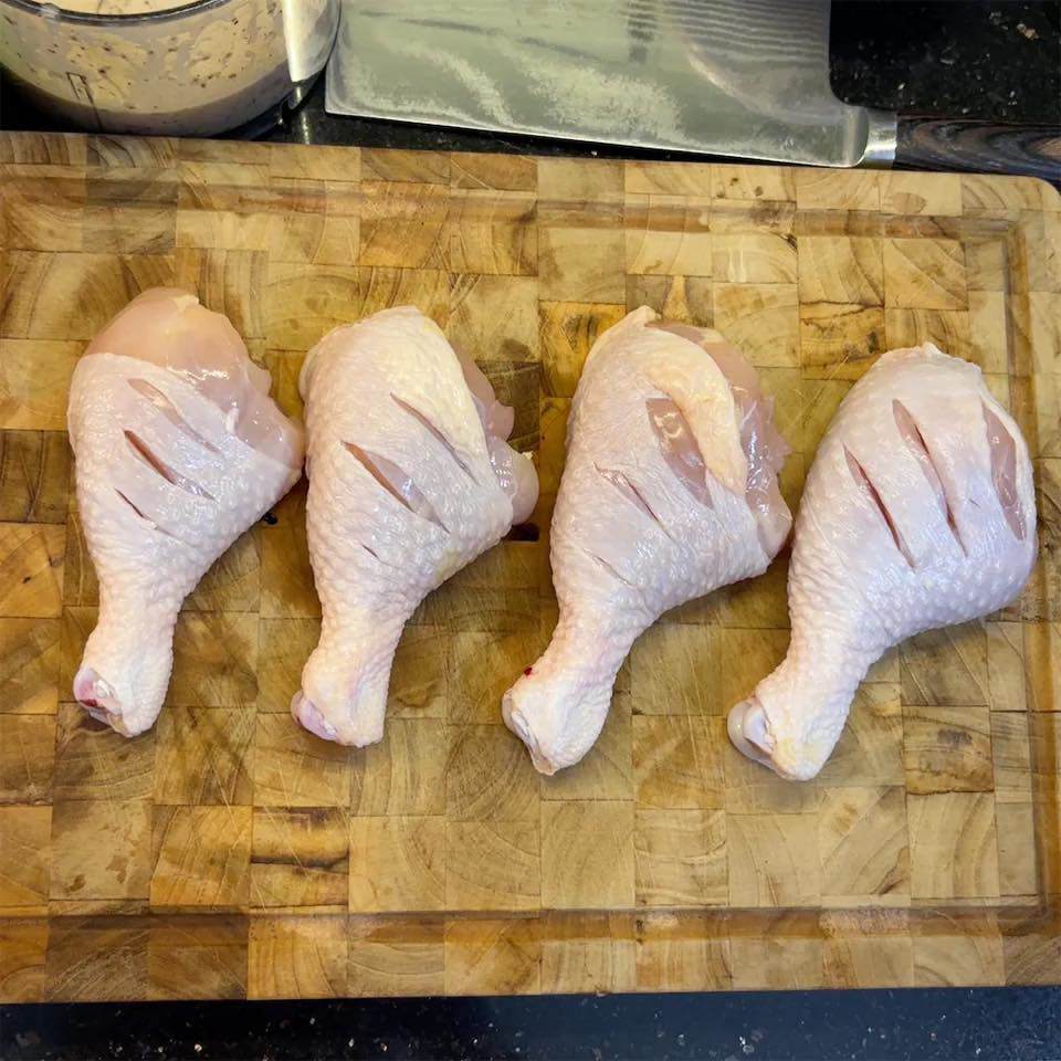 Bước 2: Dùng dao khứa 3 đường sâu ngang đùi gà để gia vị dễ thấm.