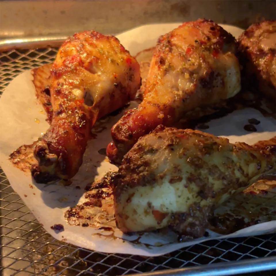 Bước 4: Làm nóng lò ở 180°C. Đặt gà lên giá nướng, lót giấy nến hoặc khay chống dính bên dưới. Nướng trong 30–40 phút đến khi gà xém vàng, thơm nức mũi.