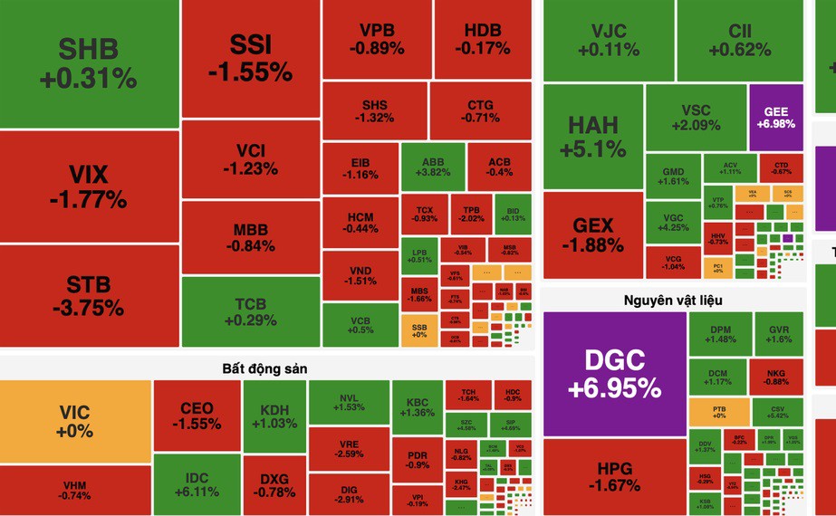 Nhóm tài chính giảm 0,38%, với STB (-3,75%), SHS (-1,32%), VIX (-1,77%), SSI (-1,55%), VPB (-0,89%) kéo lùi chỉ số. Ngược lại, công nghiệp và viễn thông tăng mạnh: VGI (+5,25%), HAH (+5,1%), VSC (+2,09%), GEE (+6,98%). Nhóm nguyên vật liệu có DGC (+6,95%), nhưng HPG (-1,67%) và FPT (-1,69%) giảm. Cảng biển nổi bật với PVD tăng trần, khớp 14,5 triệu đơn vị; HAH (+5,6%), PVT (+4,5%), VSC (+4,2%). Bất động sản phân hóa: IDC (+6,11%), KBC (+1,36%), nhưng VHM (-0,74%), DIG (-2,91%) giảm.