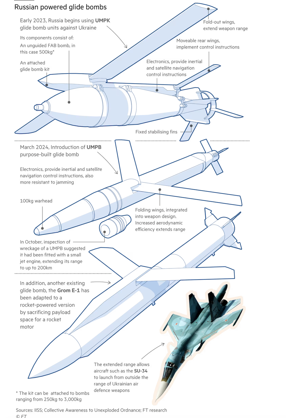 Bom lượn Nga ngày càng giống tên lửa hành trình hơn nhưng điều đánh đổi là khối lượng thuốc nổ giảm xuống. Ảnh: FT.
