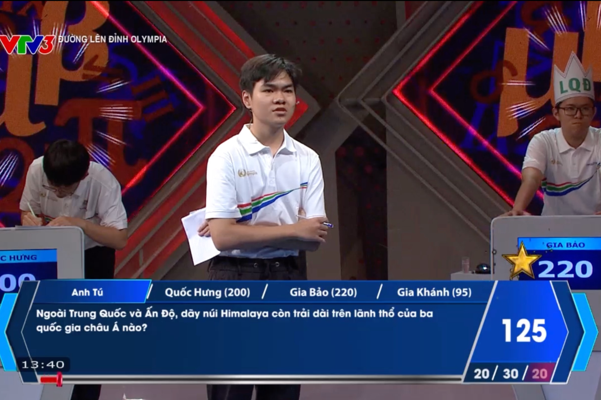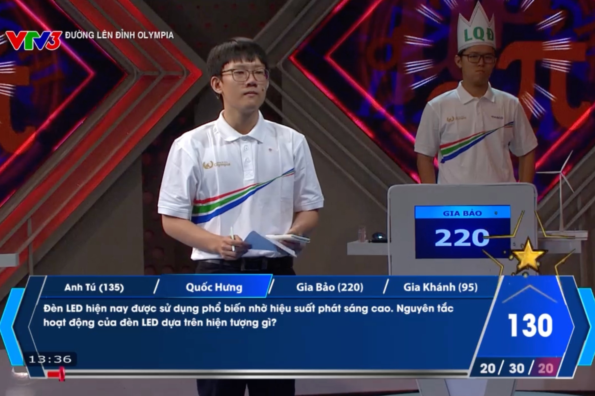 Tiếp theo, Quốc Hưng - nam sinh xếp sau điểm số của Gia Bảo chọn gói câu hỏi 20-30-20 điểm để chinh phục. Ở câu hỏi đầu tiên, Quốc Hưng không đưa ra được câu trả lời chính xác. Cơ hội thuộc về Gia Khánh - nam sinh Lạng Sơn nhanh tay nhấn chuông giành quyền trả lời và ghi được 20 điểm.