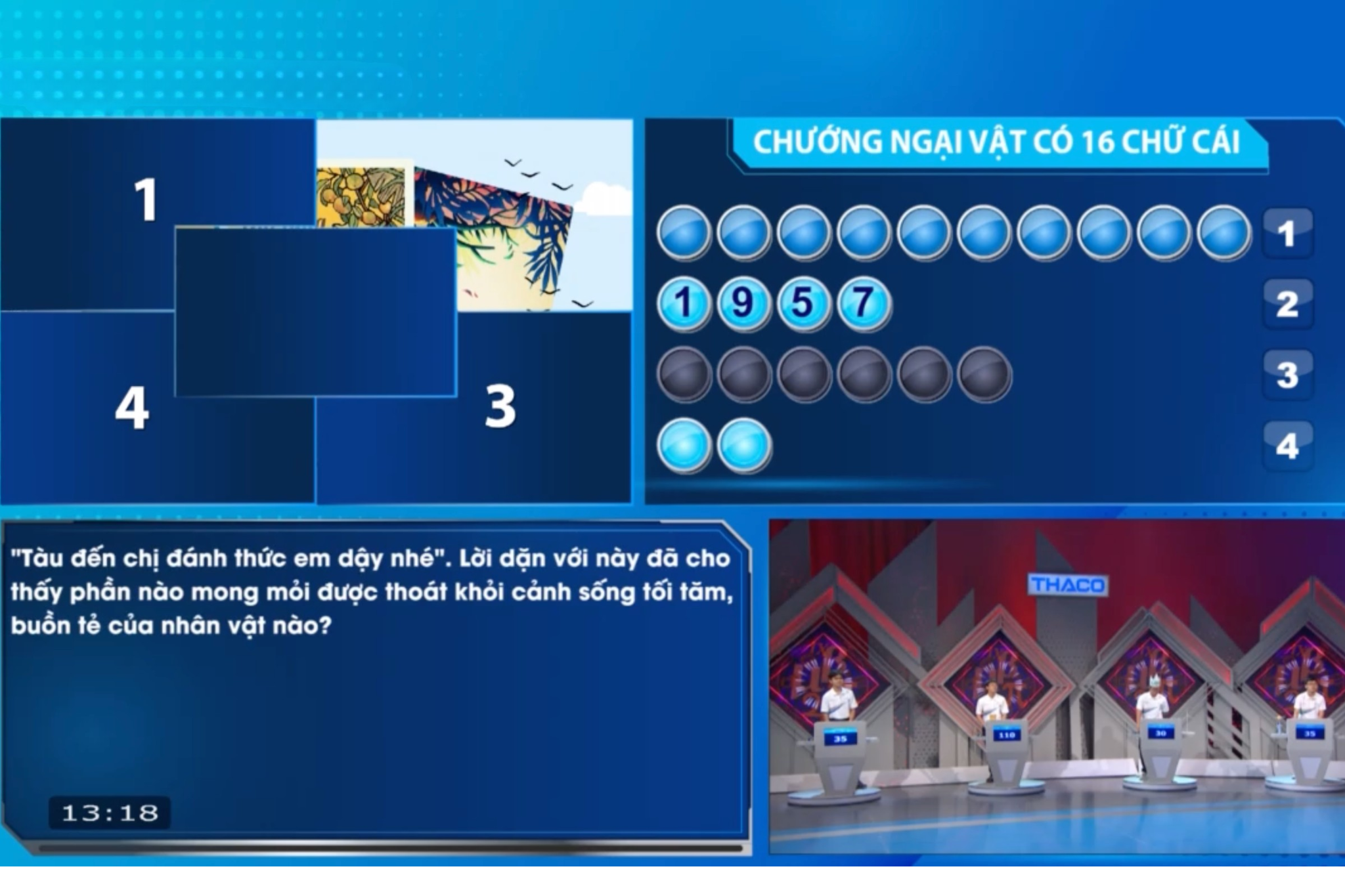 Ở câu hỏi đầu tiên, Gia Khánh đã đưa ra được đáp án cho câu hỏi về Văn học. Quốc Hưng nhấn chuông giành quyền trả lời. Nếu trả lời đúng, Quốc Hưng sẽ giành trọn 30 điểm và vươn lên dẫn đầu.