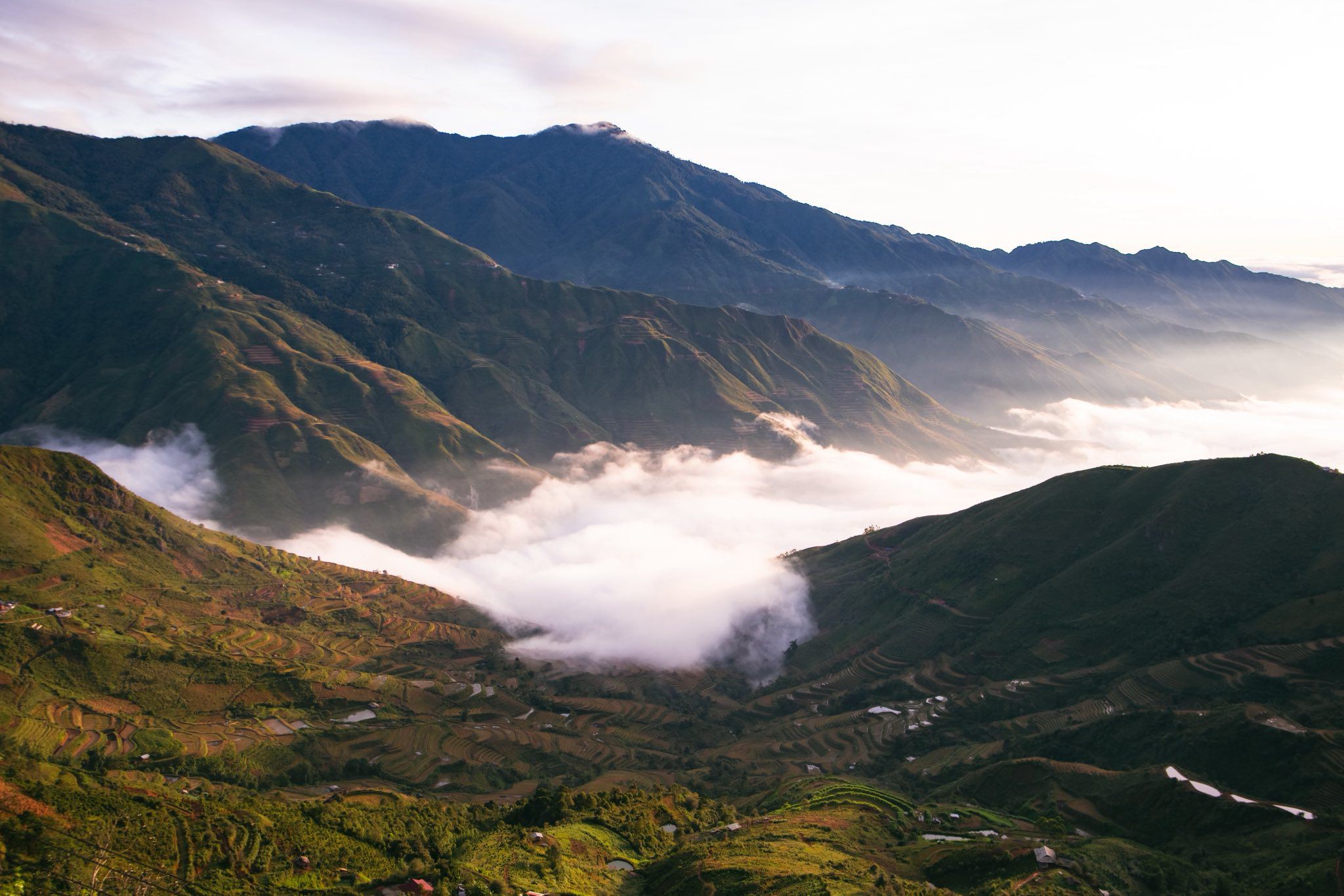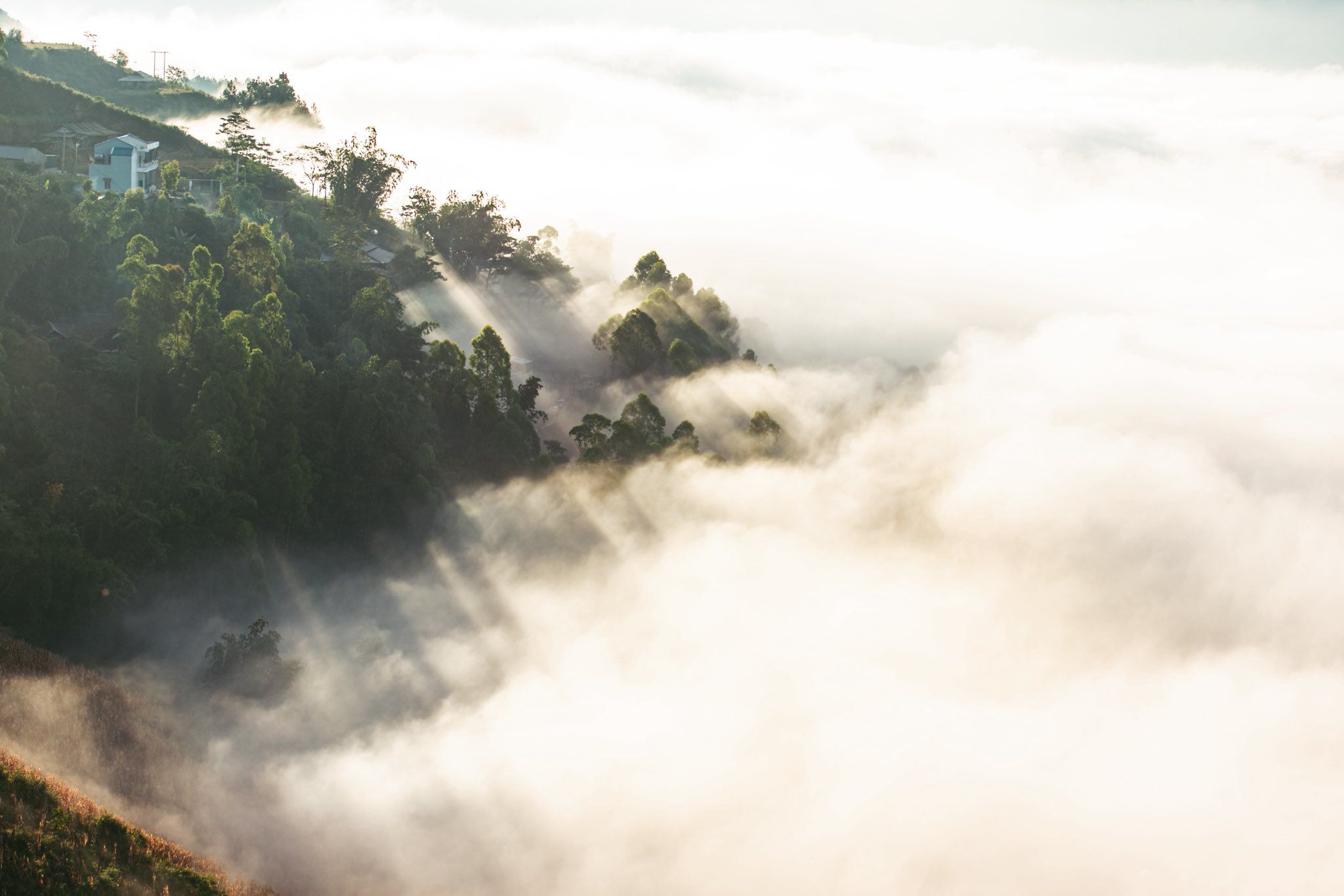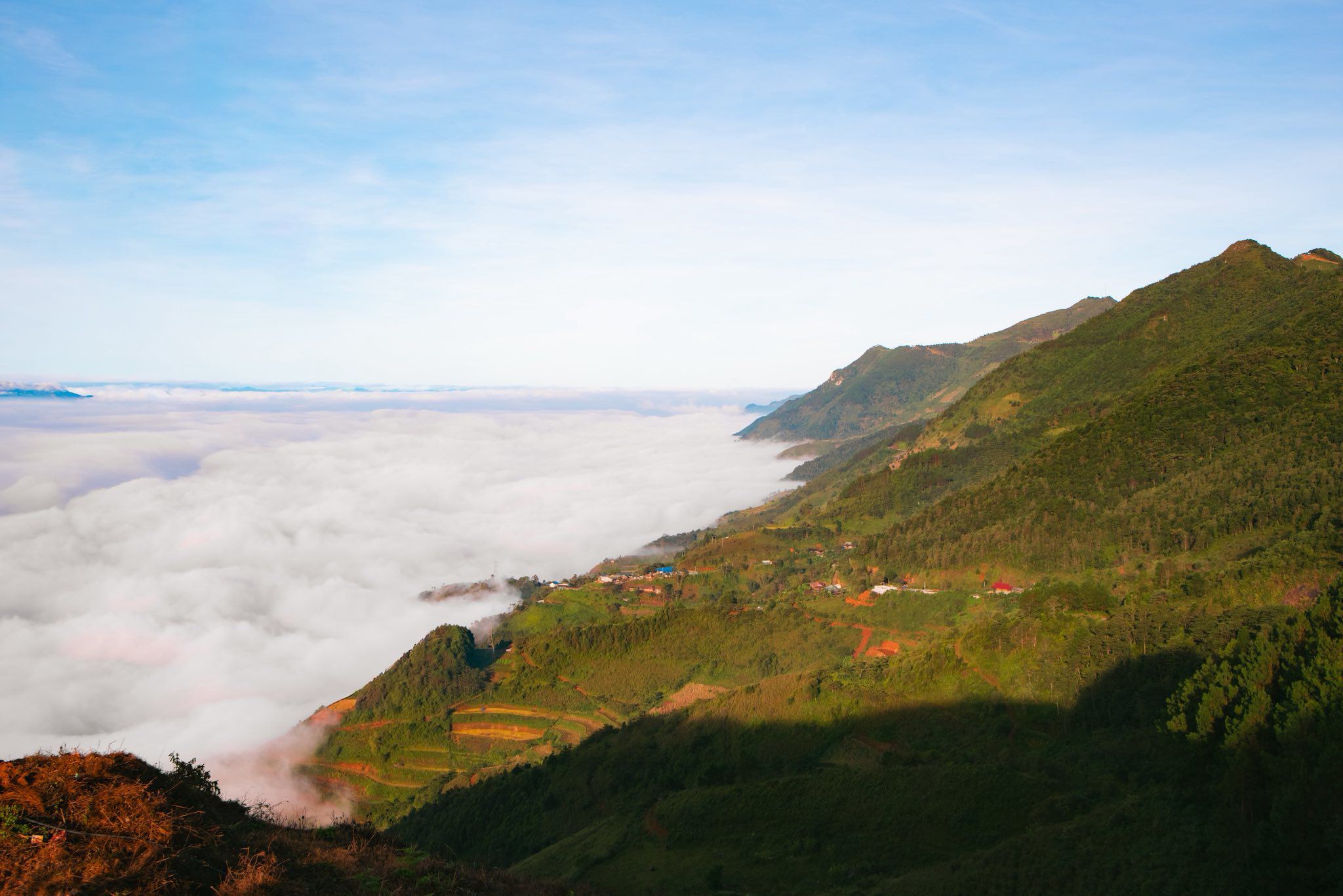 Khi bình minh vừa lên, mặt trời len qua lớp sương mờ, cả thung lũng như chìm trong “biển mây” bồng bềnh như cổ tích.
