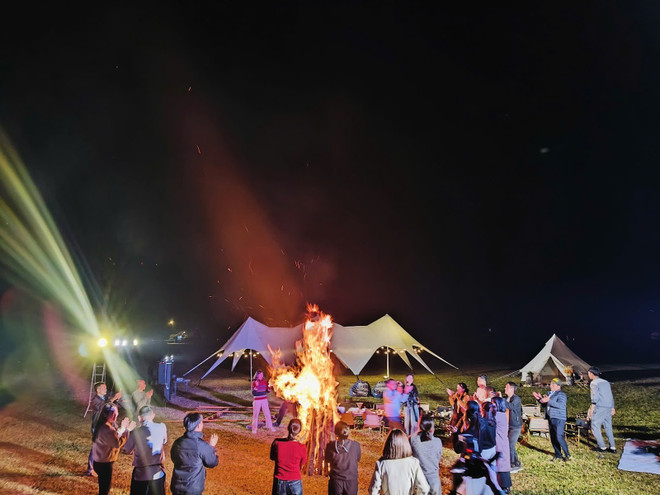Khu cắm trại nằm trên bãi bồi rộng thoáng, từ nhà hàng Nón nhìn ra, được bao quanh bởi thảm xanh núi rừng. Không gian đủ tách biệt để tạo sự riêng tư, nhưng vẫn kết nối thuận tiện với các tiện ích của khu nghỉ dưỡng.