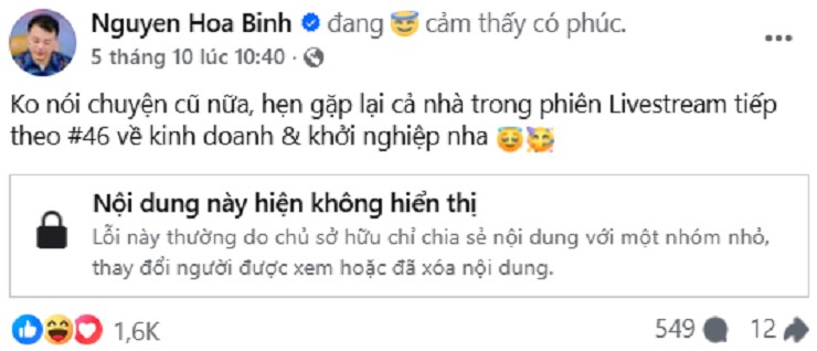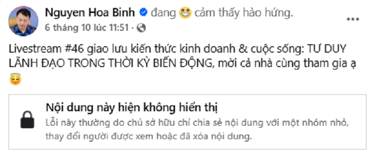 Cũng chính vì vậy mà các bài đăng được Shark Bình chia sẻ về tài khoản cá nhân đều xuất hiện kết quả “Nội dung này hiện không hiển thị”.