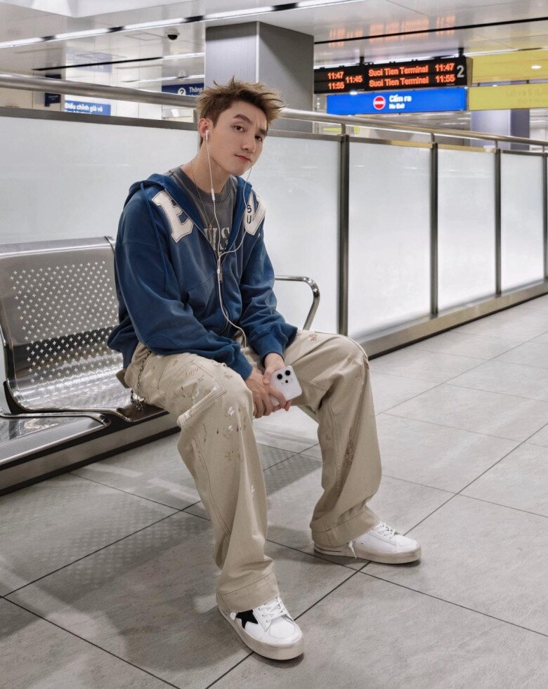 Điểm cuối trong chuyến “city tour” là nhà ga metro Bến Thành – công trình vừa khánh thành giai đoạn đầu, mang dáng dấp tương lai. Sơn Tùng mặc áo sơ mi xanh hải quân phối quần be và sneakers trắng, tạo nên tổng thể năng động, thời thượng.Anh ngồi thư giãn trên hàng ghế kim loại, mỉm cười nhìn điện thoại – hình ảnh rất đời, nhưng lại khiến dân mạng thích thú vì sự gần gũi. Ánh sáng trắng của ga metro cùng thiết kế cong mềm tạo nên background hiện đại, gợi cảm giác “vừa chill, vừa trendy”.